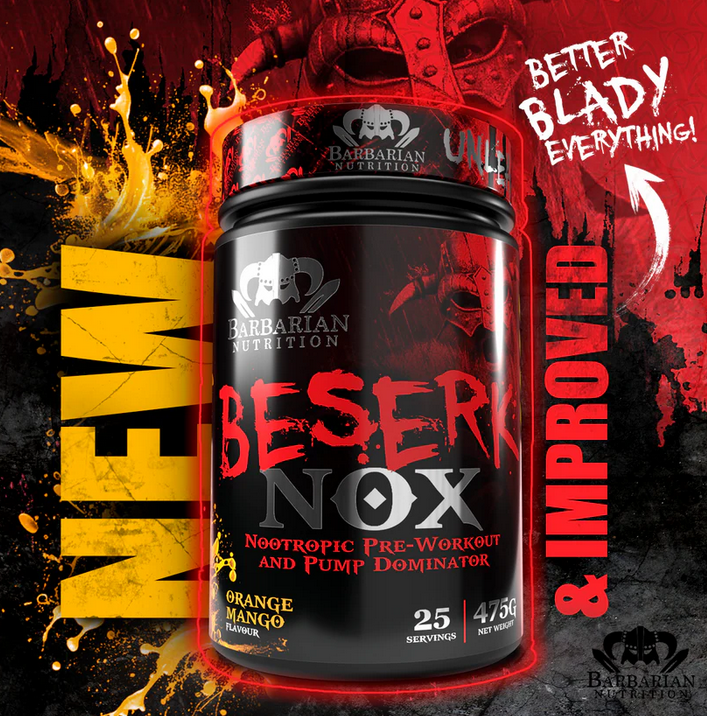 - Beserk NOX von Barbarian Nutrition setzt neue Maßstäbe in der Nootropikum-Technologie und Pumpverstärkung.