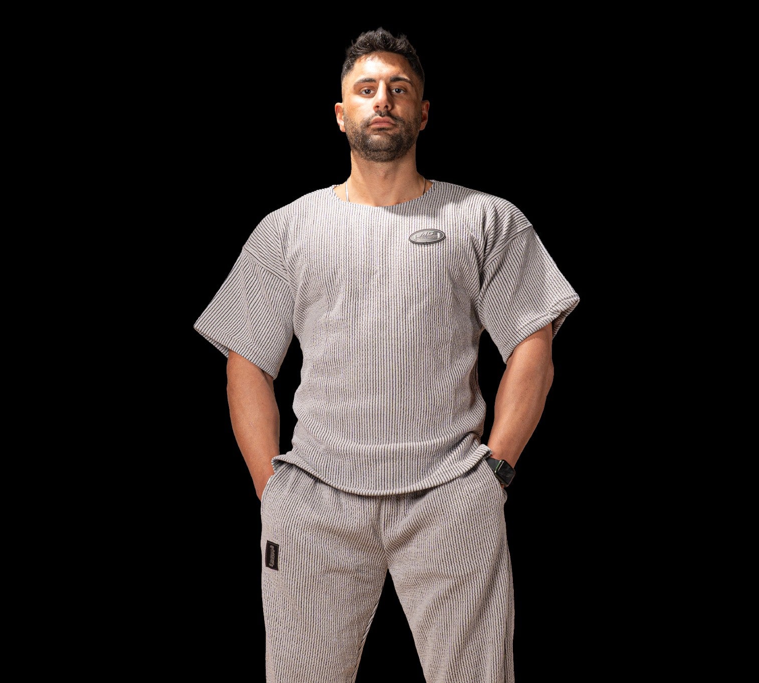 Optisch sehr interessante, senkrecht gestreifte "Hoch-Tief-Struktur" mit dezentem Logo auf der Brust. Sehr schönes Geriffeltes Muster RIB.