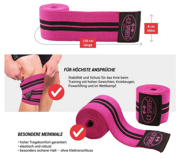 Die C.P. Sports Profi-Kniebandagen stabilisieren und stützen das Knie beim Training mit hohen Gewichten. Durch die Länge von 150 cm und die Breite von 8 cm ist ein hoher Tragekomfort garantiert. Diese Kniebandagen haben extra keine Klettverschlüsse - die Enden werden unter die eingewickelte Bandage gesteckt und bieten somit besonders sicheren Halt, der mit Klettverschlüssen nicht gegeben ist!