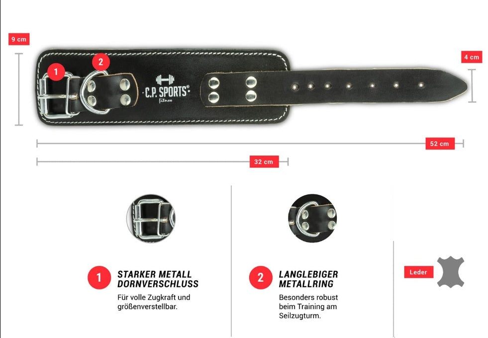 Die C.P. Sports Premium Fußschlaufe aus Leder ist angenehm gepolstert. Die Manschette mit Dornenverschluss ist mit einem Metallzugring zum Einhängen für alle Zugübungen am Kabelzugturm versehen.